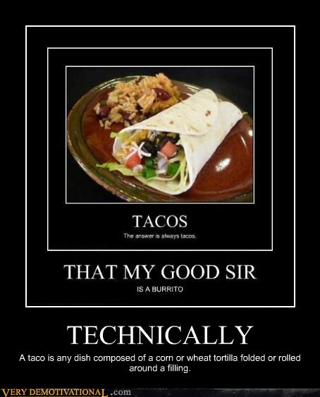 TECHNICALLY a taco is any dish composed of a corn or wheat tortilla folded or rolled around a filling.