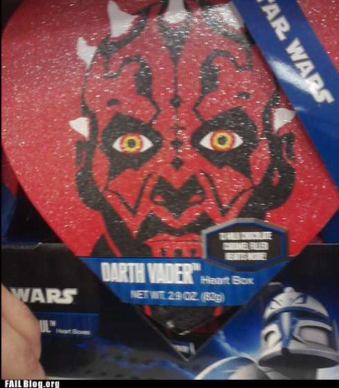 I'm not sure what upsets me more, the mislabeling or the fact that a dark and powerful Sith lord is being featured on a heart-shaped box. What's the biggest FAIL here? Let us know in the comments!