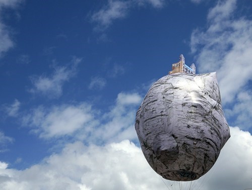 Castle of Vooruit is an outdoor balloon installation created by Kurdish-Turkish artist Ahmet Ogut of a gigantic boulder (8 meters in diameter) and a replica of the Belgian landmark and historic arts center Vooruit on its top, all floating at a height of 11 meters above the ground. Unmistakably reminiscent of Belgian painter Rene Magritte's surreal work La Chateau des Pyrenees, Ogut's helium-filled artwork was first revealed earlier this year during the TRACK art festival in May.