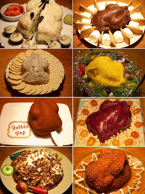 Since 2005, New York-based art director Danielle Spencer has been holding a Turkey mold contest for the Thanksgiving party at the office. Need moar? Check out the rest of Turkey-shaped appetizer dishes and desserts on her