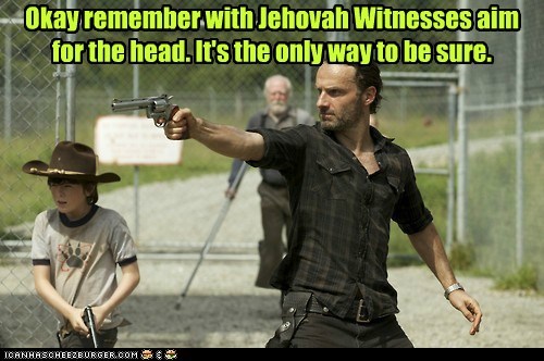 Okay remember with Jehovah Witnesses aim for the head. It's the only way to be sure.
