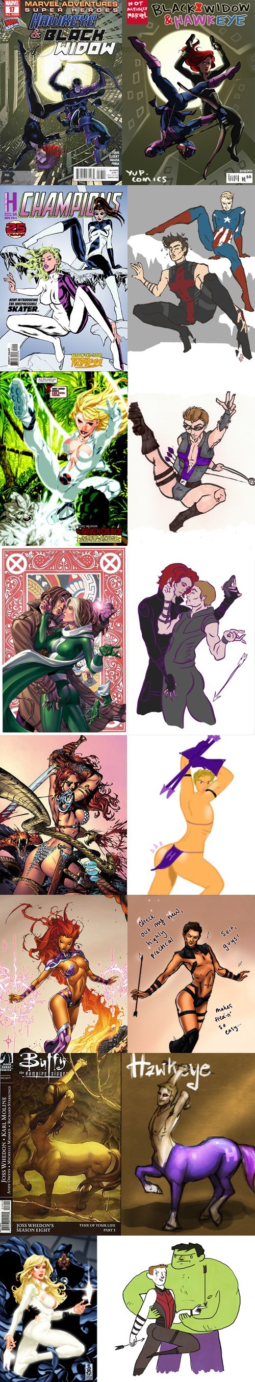 It started with the top image. An artist called Blue posted a drawing of a Black Widow and Hawkeye cover with the poses swapped. Blue then issued a challenge to other artists: replace the female characters in other comics with Hawkeye. These are just a few examples of what happened next.