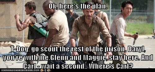 Ok, here's the plan. T-Dog, go scout the rest of the prison. Daryl, you're with me.Glenn and Maggie, stay here. And Carl - wait a second.. Where's Carl?