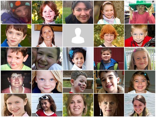 26 Victims of Sandy Hook Elementary School Shooting (from left to right, top to bottom): Charlotte Bacon, Daniel Barden, Rachel D'Avino, Olivia Engel, Josephine Gay, Dylan Hockley, Dawn Lafferty Hochsprung, Madeleine F. Hsu (no photo), Catherine V. Hubbard, Chase Kowalski, Nancy Lanza, Jesse Lewis, Ana Marquez-Greene, James Mattioli, Grace McDonnell, Anne Marie Murphy, Emilie Parker, Jack Pinto, Noah Pozner, Caroline Previdi, Jessica Rekos, Avielle Richman, Lauren Rousseau, Mary Sherlach, Victoria Soto, Benjamin Wheeler, Allison N. Wyatt. * New York Times -