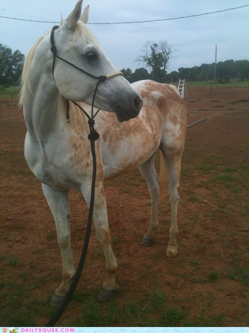 Kitten42 says: "This is my Egyptian Arab, Ataan, about five minutes before we were supposed to leave for a show. He'd been bathed and groomed. I turned my back for a few minutes, and THIS happened. I always forgive him, though. Ataan means "The Gift" in Arabic, and he's been the biggest gift of my whole life."