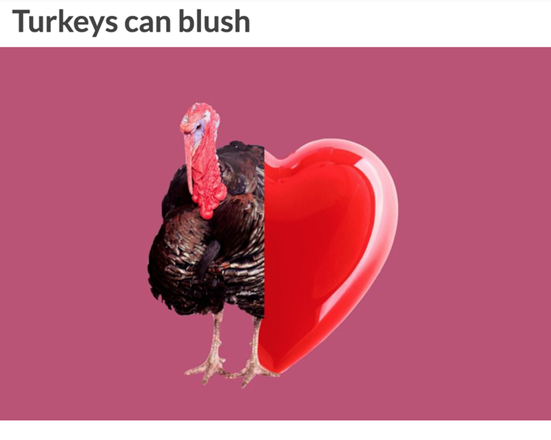 When turkeys are scared or excited—like when the males see a female they're interested in—the pale skin on their head and neck turns bright red, blue, or white. The flap of skin over their beaks, called a "snood," also reddens.