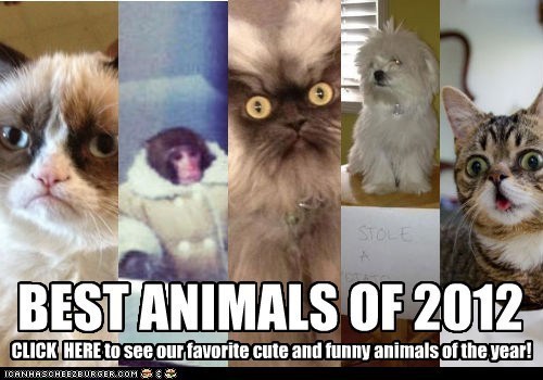 2012! What a year, amirite?! It was the year of Grumpy Cat, Ikea Monkey, ERMAHGERD, dog shaming, Lil' Bub, and Colonel Meow. It was also the year of The Dark Knight Rises and The Avengers, of "Call Me Maybe" and "Gangnam Style," and the animals of the interwebs certainly celebrated those cultural events along with us.