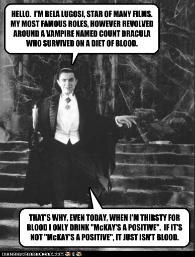 HELLO. I'M BELA LUGOSI, STAR OF MANY FILMS. MY MOST FAMOUS ROLES, HOWEVER REVOLVED AROUND A VAMPIRE NAMED COUNT DRACULA WHO SURVIVED ON A DIET OF BLOOD.