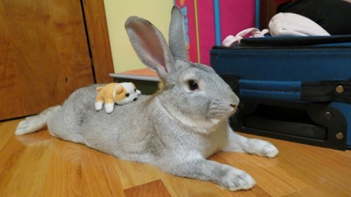 This bunny begged his parents for a puppy for so long! Looks like they finally gave in.