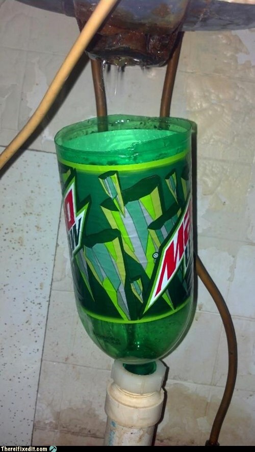 Pipe got busted, sink already leaked, so the Mountain Dew bottle came to save the day!