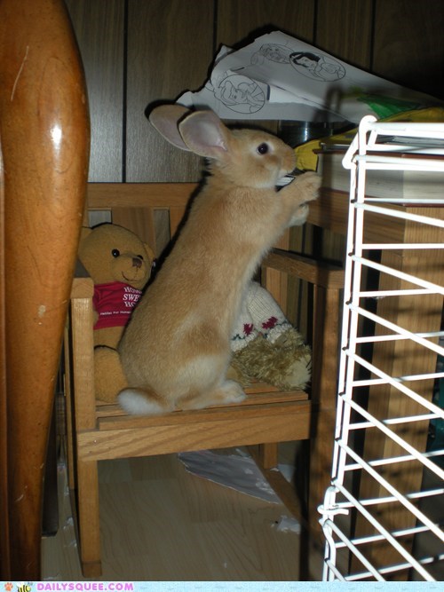 ShutterBug7 says: "This is Eli. She loves to climb on everything. She invaded the bear's rocking chair so she could chew on anything she could get a hold of on the table."
