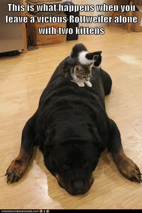 This is what happens when you leave a vicious Rottweiler alone with two kittens