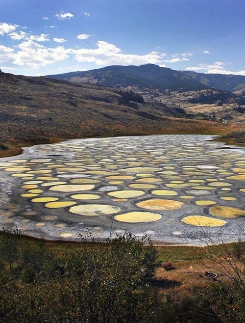 The lake appears to be a normal one during fall, winter, and a small portion of spring; but during the summer, most of the lake becomes evaporated. Dozens upon dozens of crater-like mineral deposits rest at the bottom of the lake and become visible during the warm weather. The mineral deposits span about 25 feet on average and contain many different concentrations of magnesium sulfate, and calcium/sodium phosphates, which gives them a distinct yellow, orange, green, or blue color.