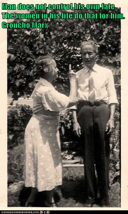 Man does not control his own fate. The women in his life do that for him. Groucho Marx