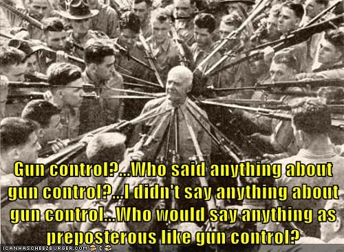 Gun control?...Who said anything about gun control?...I didn't say anything about gun control...Who would say anything as preposterous like gun control?