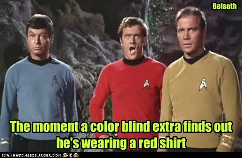 The moment a color blind extra finds out he's wearing a red shirt