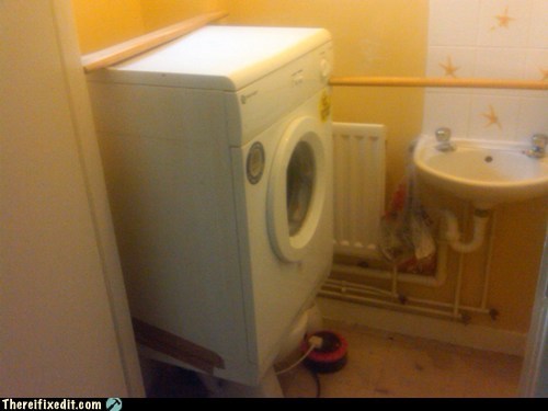 "The only place for the dryer to vent in the new house is out of a small window inside the downstairs water closet. It took a couple of reused bed slats to get it to stay on the toilet. Safety first!"