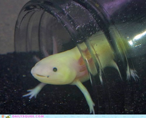 Phoenixcry says This is Bluebell the glowing axolotl being a proud home owner of a glass jar. She glows under a blacklight due to having the GFP gene from the jellyfish, so she's part squee and part science.