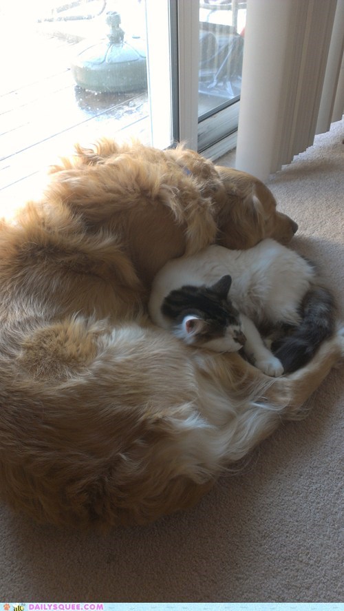 My kitten, Wigeon, loves to curl up with his big canine brother, Logan.