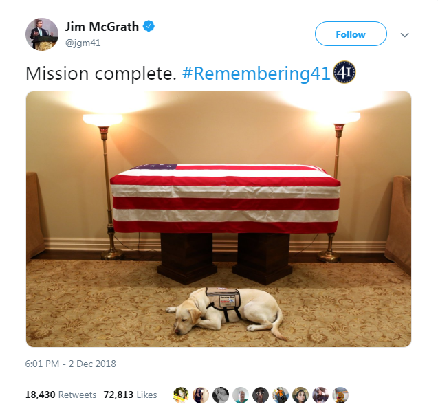 George H. W. Bush's spokesperson shared an image of the former president's service dog, Sully H.W. Bush, with the words "mission complete." George H. W. Bush died at the age of 94.