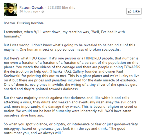 After worthless cowards do what they did in Boston yesterday, it's easy to have your faith in humanity take a serious hit. Patton Oswalt recognized that, and in the vein of Mr. Rogers' "look for the helpers" quote, Oswalt posted this poignant message on Facebook, telling people to pay attention to the droves of good people like Carlos Arredondo, who ran toward the wreckage to help the victims and even pinched a bleeding man's artery shut to save him from bleeding out. Well done, Carlos, and well said, Patton.