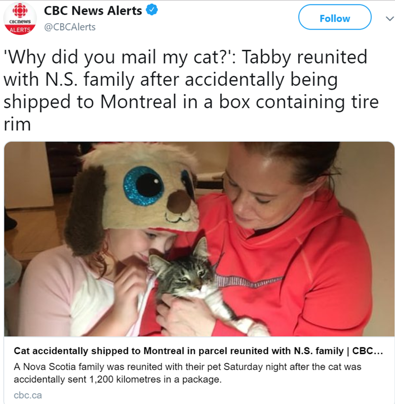 A Cat is Reunited With His Family After Being Accidentally Shipped Across Canada