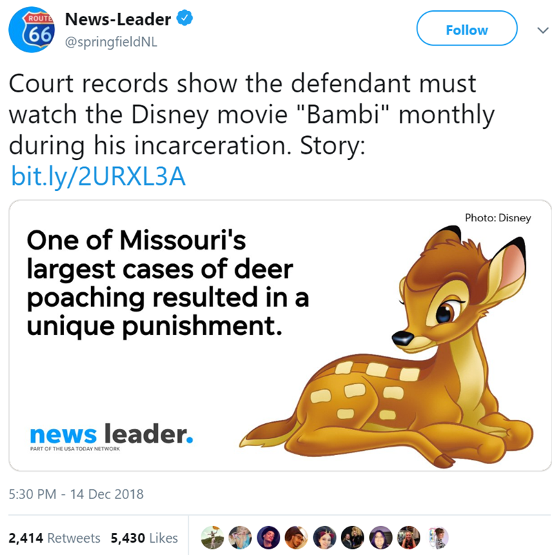 In what is being referred to as one of the largest deer poaching cases in Missouri history, David Berry Jr. has been ordered to watch Bambi at least monthly during his 120-day sentence.