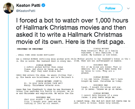 Hilariously creative writer Keaton Patti is at it again with the opening pages to a script he claims were written by a computer algorithm. He's done this before with a Diners, Drive-Ins and Dives script as well as an Olive Garden Commercial. At this point we know there is no computer program, and it's just Keaton's absurdist style, but he nails it perfectly.