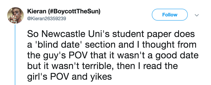 The disparity in their opinion on how the date went could not be more comically enormous. Wow, and yikes a thousand times over.