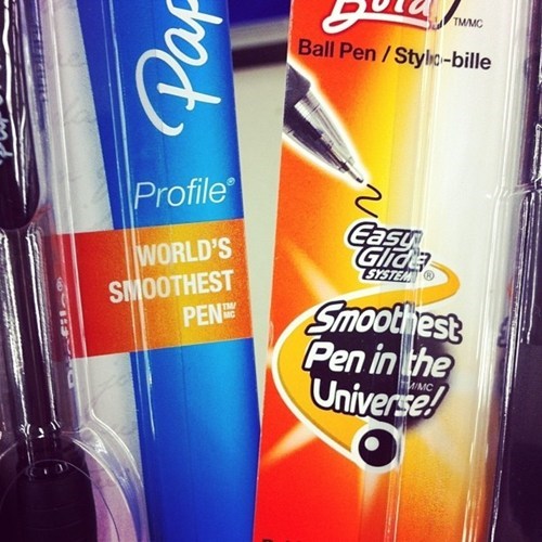 Paper Mate (left; an American company) made this their slogan. Soon after, Bic (right; a French company), changed their slogan as well. Hey you two, play nice now!