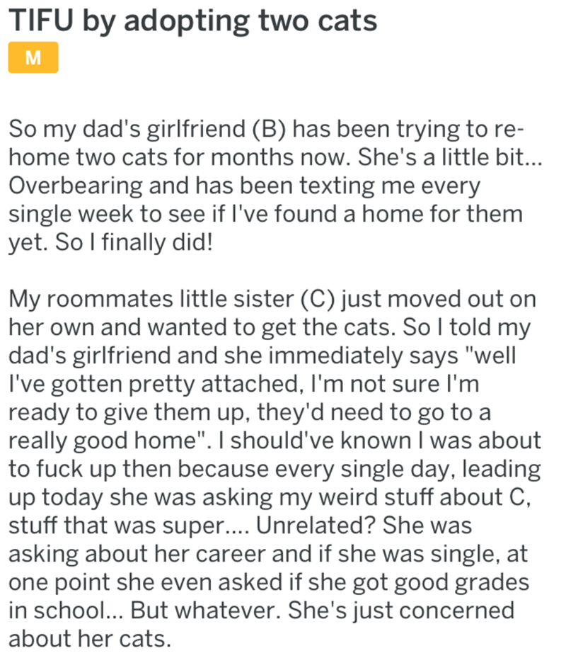 What started as an innocent cat adoption gave way to dad's crazed (ex) girlfriend throwing out accusations of satanic rituals. Can't say we saw this one coming, but alas, there's a good old-fashioned TIFU for you. People always leave us surprised.