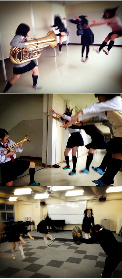 Japan's latest trending photo fad turns musical instruments into powerful air blasting weapons. Coming off the heels of the Hadoukening (better known as "Makankosappo" in Japan) pics that went viral in March, Japanese band students are tweeting photographs of themselves while in mid-leap as if they're getting blasted away by large brass "tuba guns" (or natively known as "chuuba juu"). While tubas seem to be the most popular choice of instrument for this fad, trumpets, cymbals and other musical instruments have entered the fray as well.