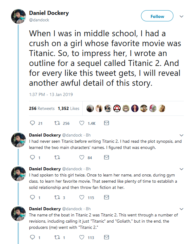 The tween years are hard on pretty much everyone (except for maybe you, Jessica R from homeroom) but this wild ride of a Twitter thread takes those awkward years to the next level. Cracked editor Dan Dockery treated the social media site to a very detailed and very cringey account of his desperate (and creative) attempts to win the affection of his crush. It's...incredible.