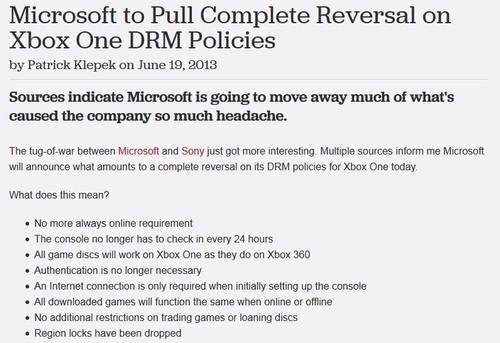 Multiple sources (this one from Giant Bomb) says that Microsoft is reversing many of their decisions. If you go to the news page on Xbox.com the Xbox One Q&A is being updated as of right now. The updated page is unavailable right now but after the news is live straight from the horse's mouth, we will update.