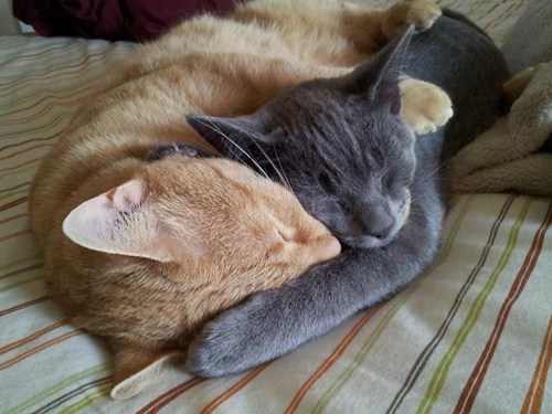 **monikalehte says** This is my submission for the Daily Squee! I know my head exploded when I saw this! Sunny was found on the train tracks at my station. He is your typical orange tom cat bad boy... until he met Graycie. I adopted her from a local rescue. They are best friends and snuggle partners. :)