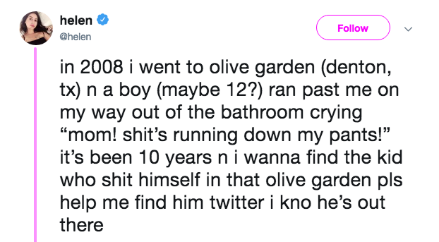 This woman used the power of Twitter's photo-identifying capabilities, or whatever else kind of eerie search-magic is going on here, to track down a boy, since grown up, who had one noxious smelling mess of an accident in an Olive Garden. To his credit, he steps forward to claim credit for the mess, and now it's on his bio. Shamelessness? Clout-chasing? Or just a chill dude who doesn't give a sh*t about an old Olive Garden-baked sh*t? Who's to say.