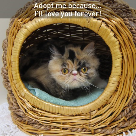 Some may say Furby looks like an alien, but we think she looks like the perfect pet. She's hesitant with strangers at first, but warms up easily and then becomes quite outgoing. She'd prefer not to be picked up, though she does love to rub all over friendly people and sit next to them for a petting session. She's more on the couch potato end of the spectrum, but has been known to play with ping pong balls sometimes. She also loves to be brushed!