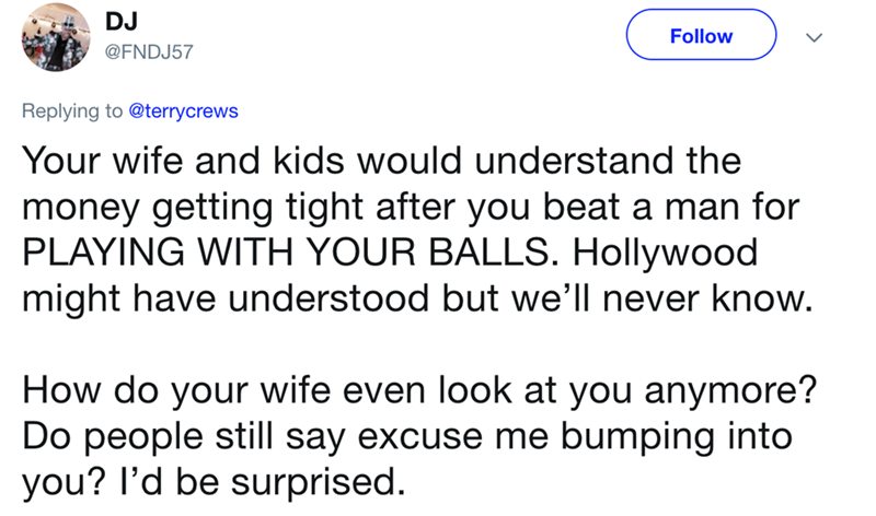 Terry Crews addressed an incendiary, insensitive statement from a troll on Twitter, with a brutal burn that didn't sacrifice classiness in the process. We were just saying the other day how, Terry Crews, is the real MVP. And it's moments like these that really serve to drive the point home. The man faces bullsh*t-ridden verbal assaults that internet trolls send behind the (sometimes) anonymous safety of their computer screens, with self-respect, strength, and fire in his veins. We're all about it.