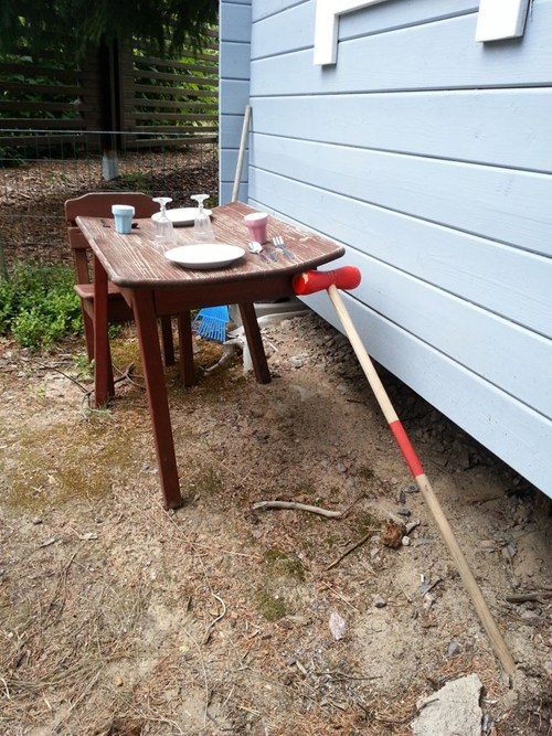 Kids asked me to fix the table a few times, but since there was no duct tape nearby, I didn't know how. So they came up with this.