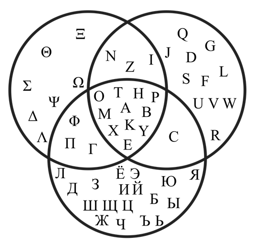 Greek (left), Latin (right) and Cyrillic (bottom) Alphabets