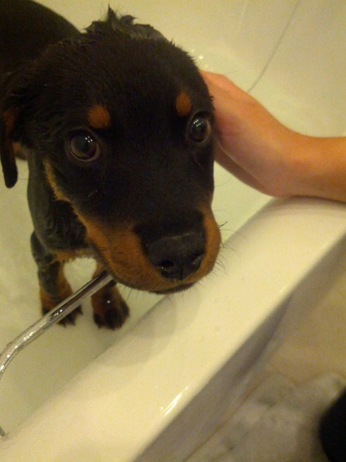 Izzy says This is Loca, she's only just turned 4 months old, and we decided it was time for her to take a bath! if she didn't hate it so much.