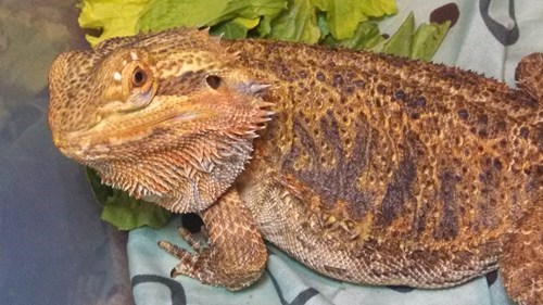 **Destiny says** My bearded dragon, Athena, had a bath today. She hated it and when I put her back in her house, she stomped to the corner, turned her head and gave me this look!