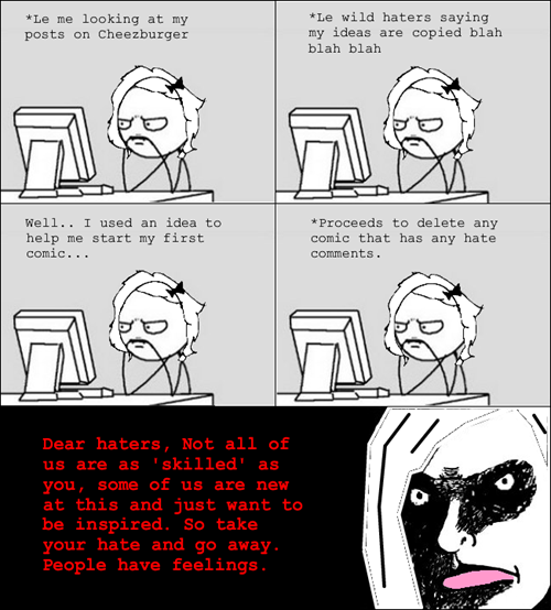 Am I the only newbie on here? Seriously, I just wanna post whatever, I'm not stealing if I use an idea, crushing other peoples fun? Seriously? People feel bad. How 'bout i go and hate all your first comics. Just my opinion, be offended if you feel like it. I just needed that off my chest.