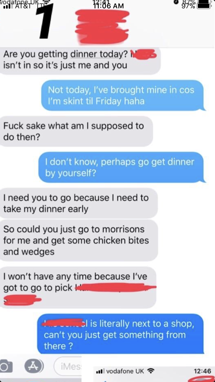 It sounds like a particularly testy coworker is blowing their 2 week old surgery far out of proportion, to milk another free and gracious handout. In this case, they are appalled beyond belief, when their coworker won't hook 'em up with some chicken bites. Not the chicken bites! They learn a quick lesson in how being rude to someone, does NOT make them want to help you. Wow.