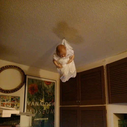 's dad got hold of a super realistic baby doll to sell on eBay, and this is how he is storing it.