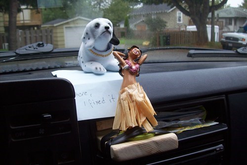 User frailea says: For a long time I'd been wanting a hula doll for the dashboard of my truck, but the slope of the windshield just won't allow for it. My partner decided enough was enough. The hula doll is the worst hula doll I've ever seen. I particularly love her happy, vacant expression.
