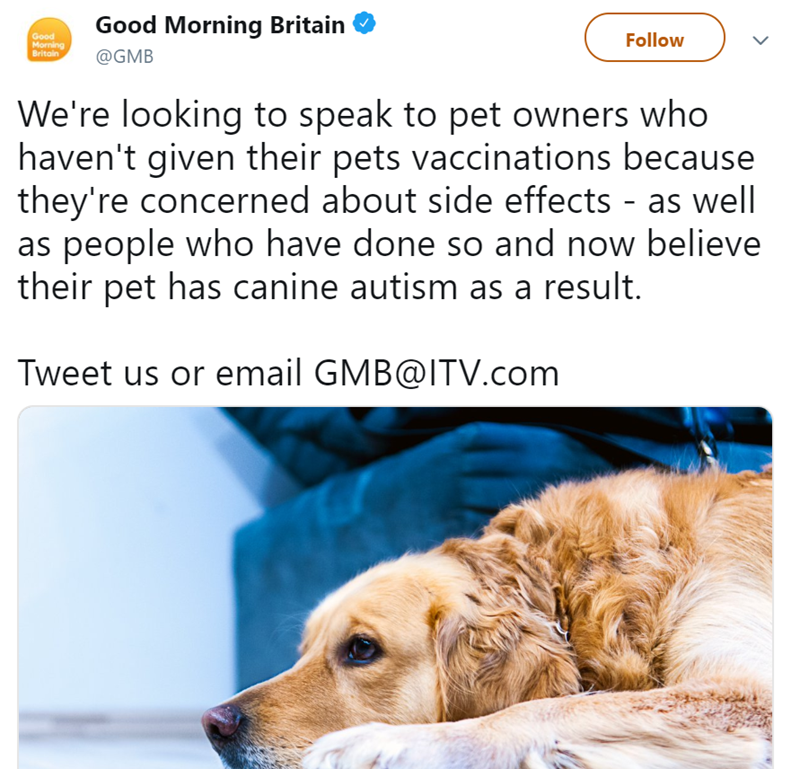 Following this tweet, The British Veterinary Association issued a statement stressing the importance of having pets vaccinated and debunking the link between vaccinations and autism in dogs