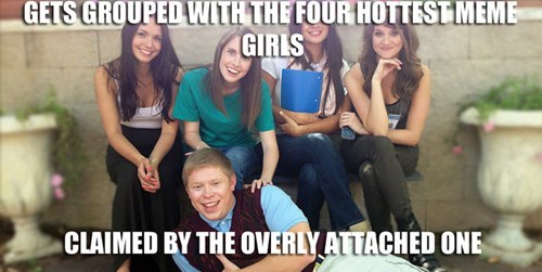 From left (clockwise): Good Girl Gina, Overly Attached Girlfriend, Sheltered College Freshman, Host of Meme Hunters, Bad Luck Brian.