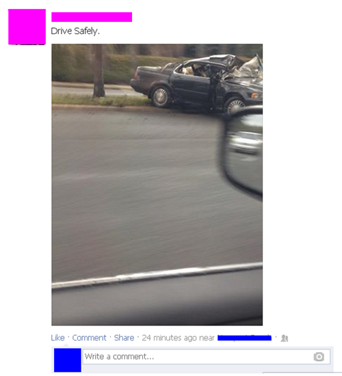 Well, let's see here. There's another lane on the other side of the tree, meaning she's on the right side of the road. If she's on the right side of the road, that means she's not in England or Australia. If she's not in England or Australia, that means that she's on the left side of the car, and the last time I checked, left-side backseat passenger windows don't have sideview mirrors. Lie busted.