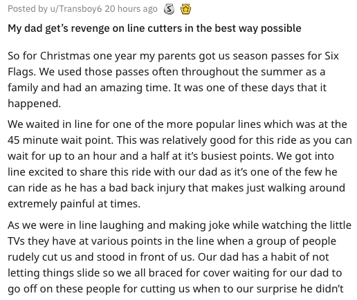 When you have to wait in line for an hour to get on a ride, a line-cutting can turn into a fistfight. With a little forethought, this dad effectively got someone back for being a jackass, and left them with the ability to do absolutely nothing about it. What a dad move. Hot damn.